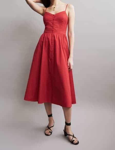 Vous pouvez aussi miser sur les robes à bretelles fines. Elles laissent les épaules respirer, sans accentuer la largeur. Optez pour une coupe qui marque la taille et s’évase sur le bas : l’effet sera flatteur, tout en allégeant la silhouette.