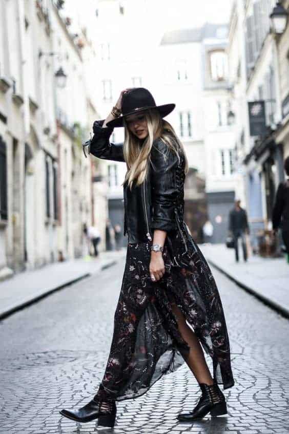 La robe longue s’accorde avec presque tout. L’association la plus simple ? Un perfecto en cuir ou une veste courte, pour briser le côté trop sage. C’est là toute la force de la robe longue : avec la bonne veste, elle se porte du matin au soir, du bureau à la terrasse. Pour une sortie décontractée, une veste en jean fait des merveilles. Pour une journée plus habillée, testez un blazer court ou une petite veste en tweed. Et quand la soirée se rafraîchit, une grande écharpe ou un châle un peu épais suffit à apporter élégance et confort. Deux pièces, et voilà une tenue moderne et efficace.